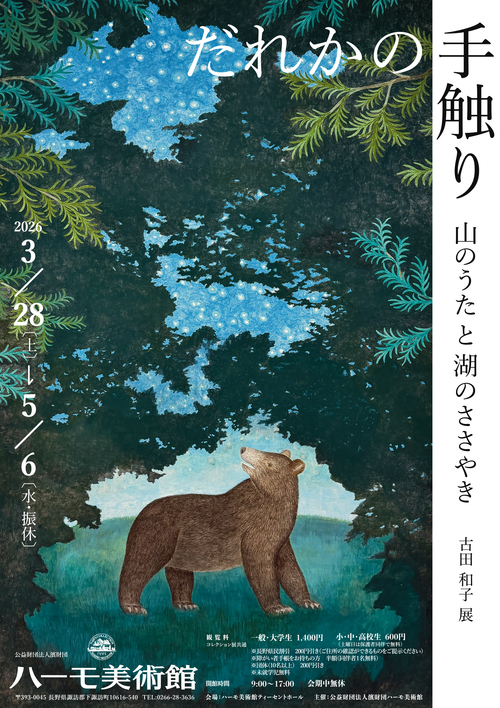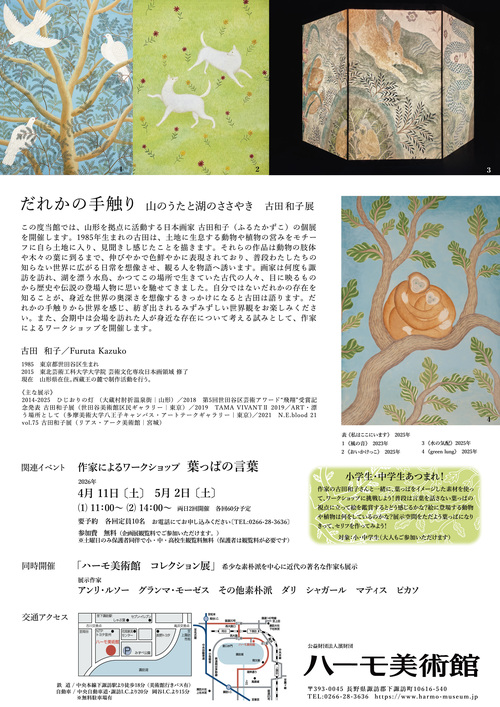この度当館では、『だれかの手触り -山のうたと湖(うみ)のささやき- 古田和子展』と題し、山形を拠点に活動する日本画家 古田和子の展覧会を開催いたします。1985年生まれの古田は、土地に生息する動物や植物の営みをモチーフに自ら土地に入り、見聞きしたことを描きます。それらの作品は動物の肢体や木々の葉に到るまで、伸びやかで色鮮やかに表現されており、普段わたしたちの知らない世界に広がる日常を想像させ、観る人を物語へ誘います。画家は何度も諏訪を訪れ、湖を漂う水鳥、かつてこの地で生きていた古代の人々、目に映るものから歴史や伝説の登場人物に思いを馳せてきました。自分ではないだれかの存在を知ることが、身近な世界の奥深さを想像するきっかけになると古田は語ります。だれかの手触りから世界を感じ、紡ぎ出されるみずみずしい世界観をお楽しみください。